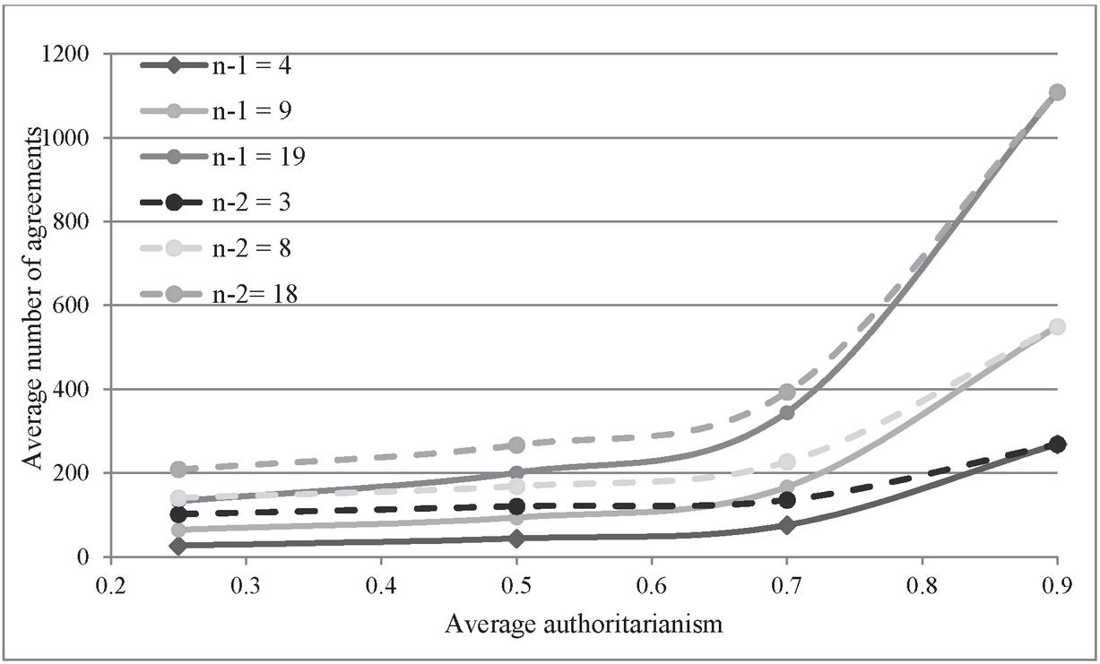 stands for the average number of agreements, stands for the number of group members (excluding the autocratic leader), is average authoritarianism of group members (excluding the autocratic leader).