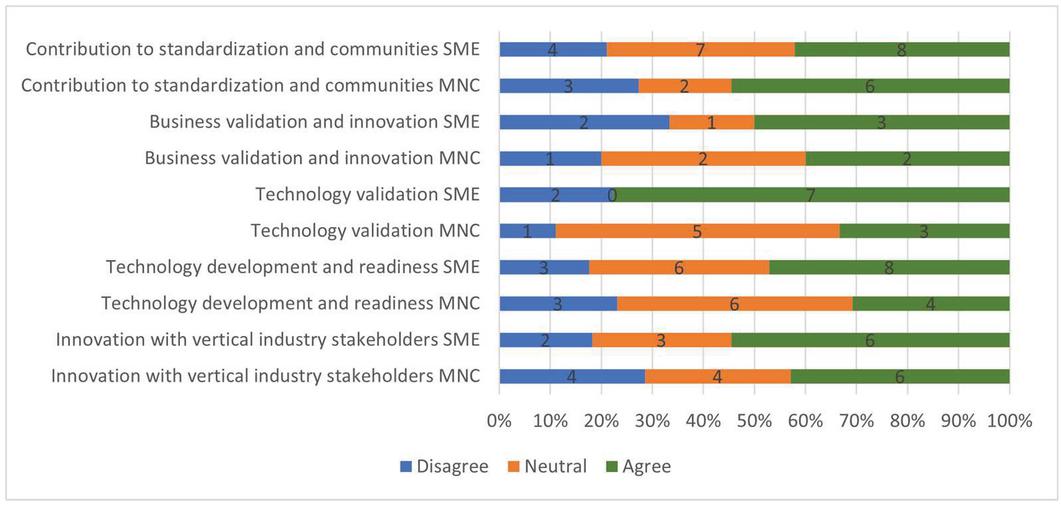 The invitation to join the online survey was distributed to 5G-SOLUTIONS partners, 5G PPP SME WG members and private companies that had previously participated in different webinars arranged by 5G-SOLUTIONS. The survey yielded 42 responses, of which 24 and 18 were from employees of SMEs and MNCs, respectively. Thirty-nine respondents stated to were involved in R&I projects and (in one or more activities) in the 5G-SOLUTIONS project. The SMEs included in the survey ranged from six to 70 employees (50%), while the MNCs were primarily large corporations with over 250 employees (43%). Most respondents came from the information and communication sector (55%) followed by the scientific and technical service sector (17%). The remaining respondents were from the manufacturing, electricity and agriculture sectors. 5G-SOLUTIONS [10] is a project that aims to validate (technologically and businesswise) different use case innovations with vertical domains such as Industry 4.0. It has 26 different ecosystem partners and the project is scheduled to terminate in the fall of 2022. One of the specialists we interviewed as preparation for the SME and MNC interviews was from the 5G PPP SME workgroup. This is a cross-5G project group that aims to promote the skills of SMEs in the telecommunication domain, especially among larger companies and research organizations [1]. Three interviews were also conducted with strategically selected partners from the 5G-SOLUTIONS project [36]. The purpose was to provide SME and MNC perspectives and in-depth insights on the R&I activities and the administrative side of collaborative activities. Thus, we applied multiple data sources in this case study in accordance with the triangulation principle described by Yin [36] and Bryman and Bell [37].